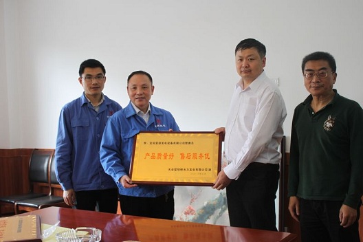 2013年3月30日,天全黎明橋電站丁總、徐總與寶興縣澤根電力公司楊總專程蒞臨富源公司,親自向董事長贈送 “產品質量好 售后服務優”、“誠信富源 真誠唐總”信譽獎牌。